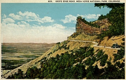 The Knife Edge Road, built as a pack trail for homesteaders, was improved for wagons in 1911, then improved again for automobiles in 1923. It was the road to the cliff dwelling until the Morefield Canyon Tunnel was completed in 1957. The rock formation above the road was originally called “Crinkley Edge.”