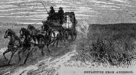 Gold seekers began moving Pikes Peakward on the Smoky Hill Trail in 1859. This trail was a wagon road blazed specifically for the Colorado gold rush. Used by gold seekers, stagecoaches, and freighters, it was the shortest route between the Missouri River and the new goldfields of Colorado’s Rocky Mountains. The route, which followed the Smoky Hill River across Kansas, then across the high plains of Eastern Colorado, would become the route of a railroad, early “auto trails,” U.S. Highway 40, and present-day Interstate 70.