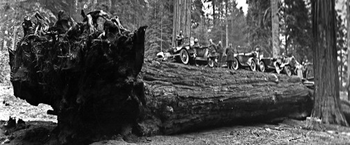 The National Park-to-Park Highway publicity tour cars parked on “Auto Log” in the Giant Forest. The fallen sequoia is now off limits to vehicles.